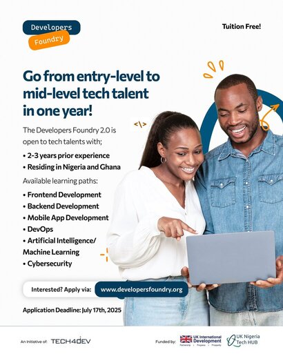 Applications are now open for the 2025 Developer Foundry Fellowship, a fully-funded, one-year immersive program designed to help entry-level tech talents in Nigeria and Ghana transition into confident, mid-level professionals.